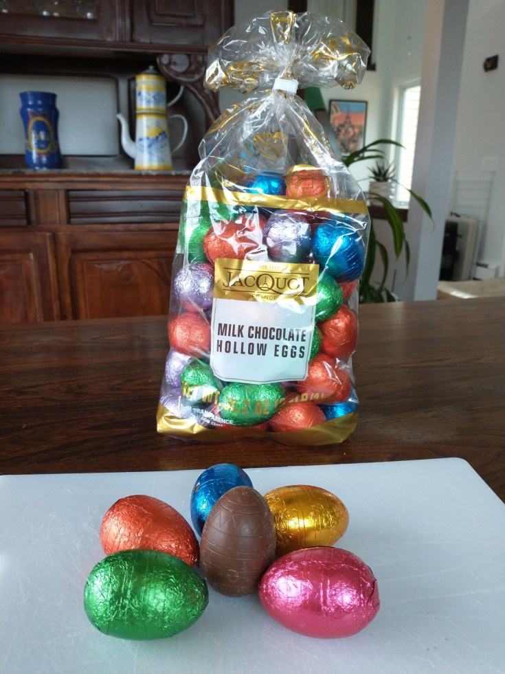 Alors, imaginez ma joie de trouver un jour par hasard, un paquet d’œufs en chocolat Cémoi dans les rayons de Costco. Ils étaient habillés de leurs habits de couleurs et m’appelaient de leur voix lactée au chocolat. Ce n’était pas la tablette de mes rêves avec ses 75 % de pur bonheur, mais j’étais au paradis ! Chaque année, j’attends les premiers jours du printemps pour les retrouver. Maintenant, ces œufs en chocolat s’appellent Jacquot et malgré cette nouvelle identité, je les aime toujours autant.